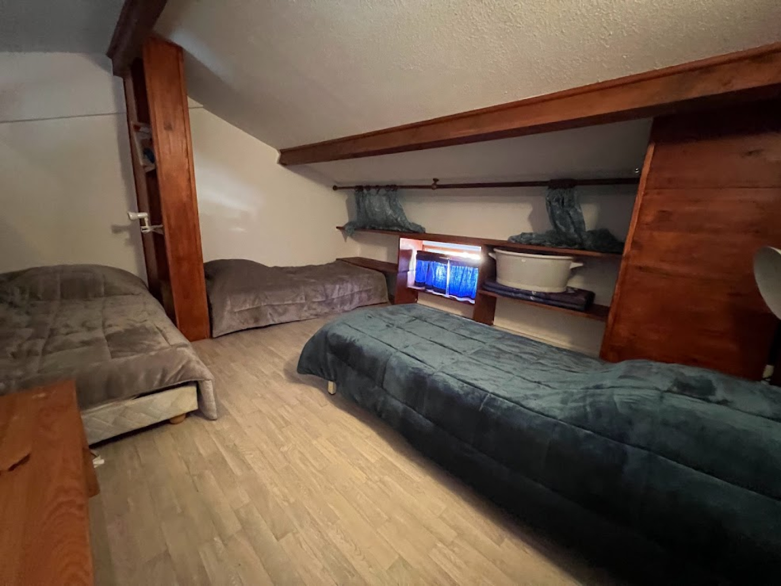 Salle d'eau avec douche et wc et à l'étage une mezzanine avec fenêtre avec 3 lits pour 1 personne.
