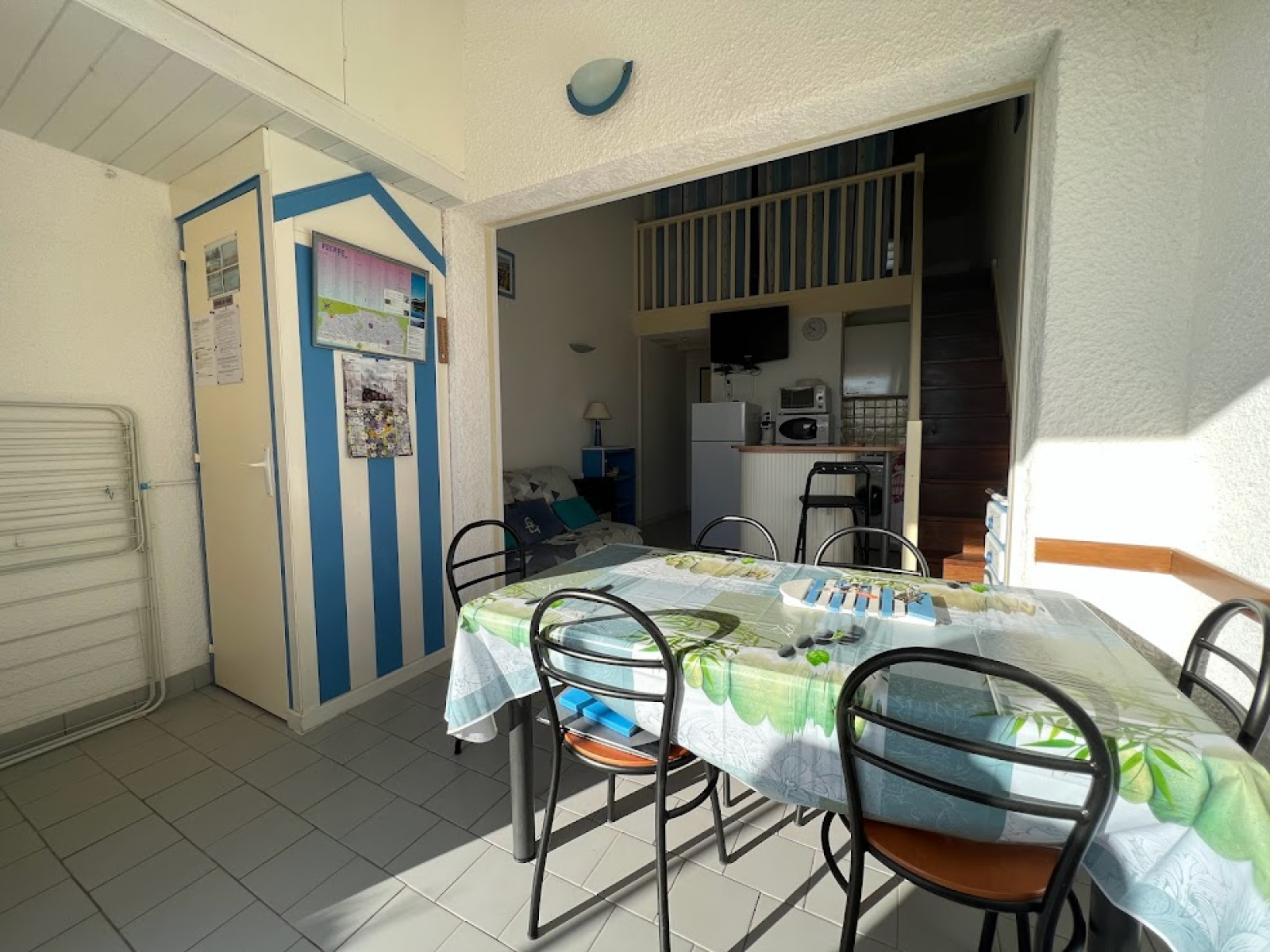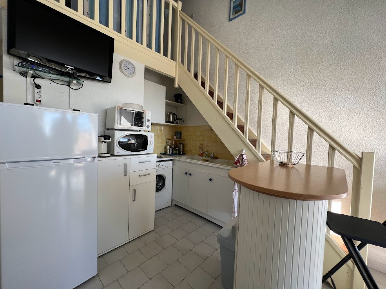 Ce pavillon se compose d'un séjour cuisine équipé (lave linge, frigo congèl, micro ondes, tv...)