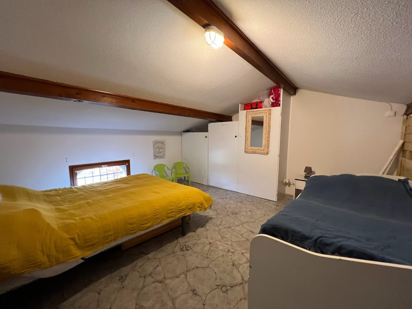 Salle d'eau avec douche et wc et à l'étage une mezzanine avec fenêtre avec 1 lits pour 2 personnes et 2 lits gigognes.