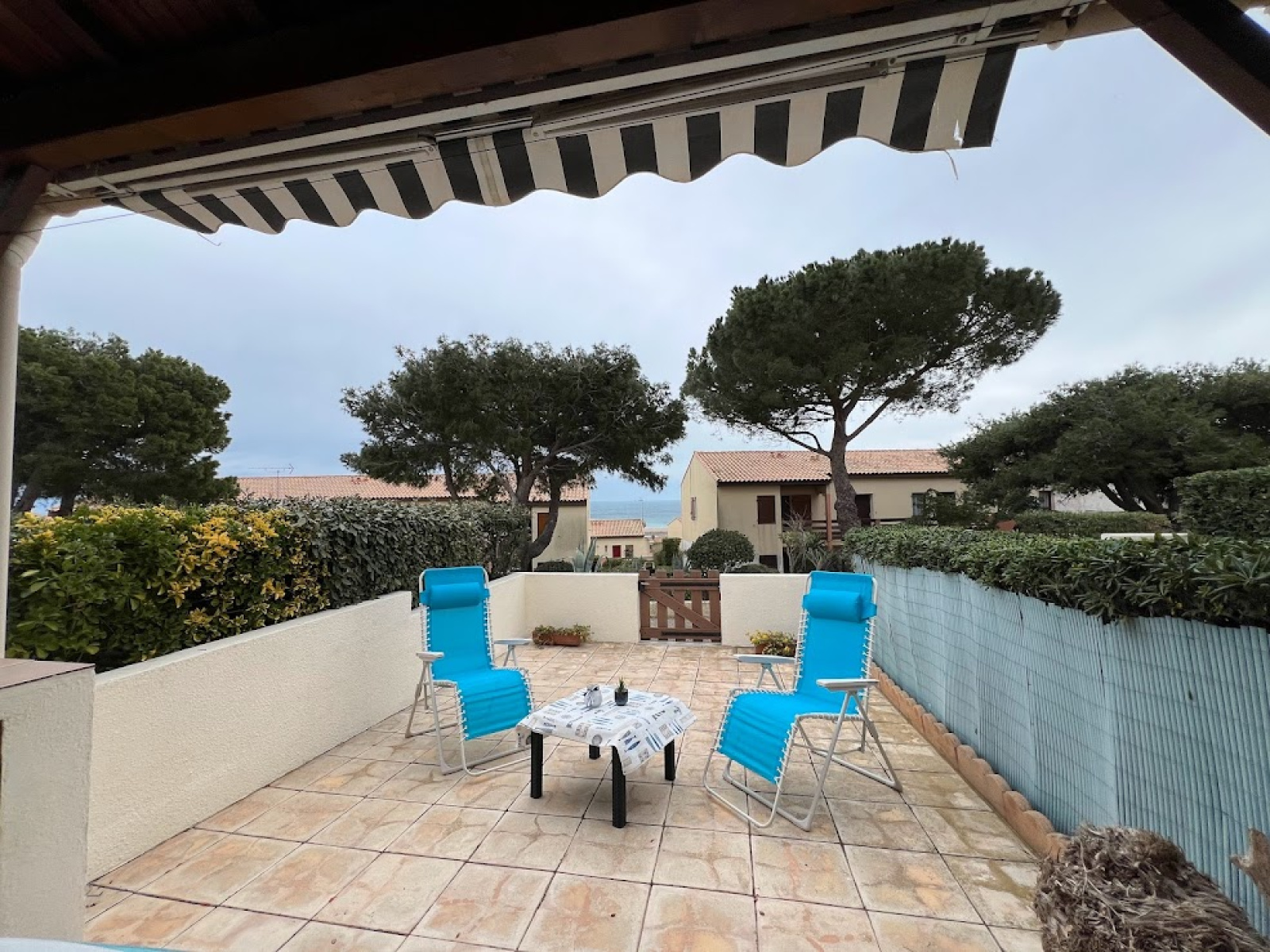Terrasse en partie couverte barbecue parking privé et piscine.
