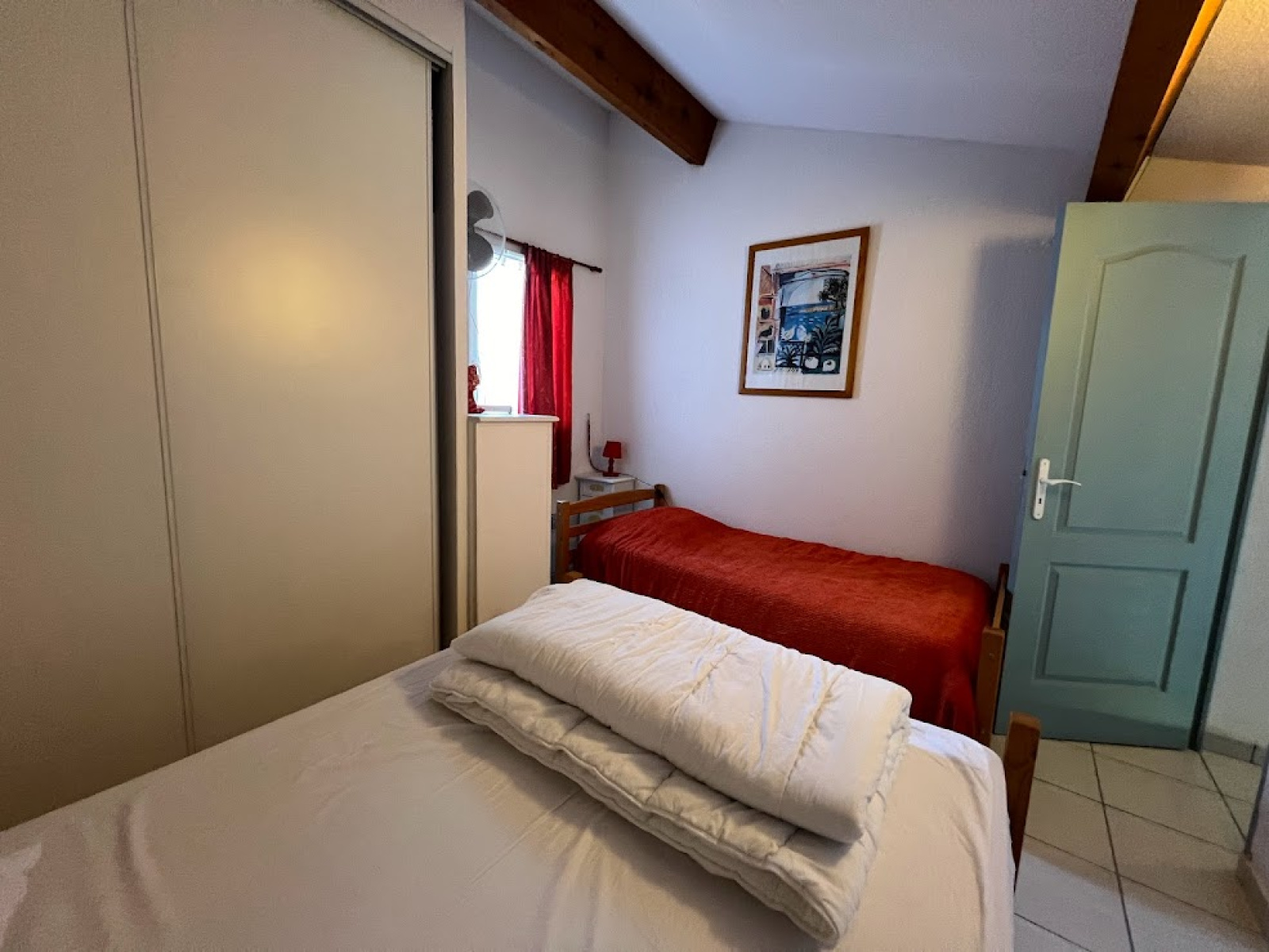 A l'étage, il y a une mezzanine avec un couchage pour 2 personnes et une chambre avec un lit pour 2 personnes et 1 lit 1 personne.