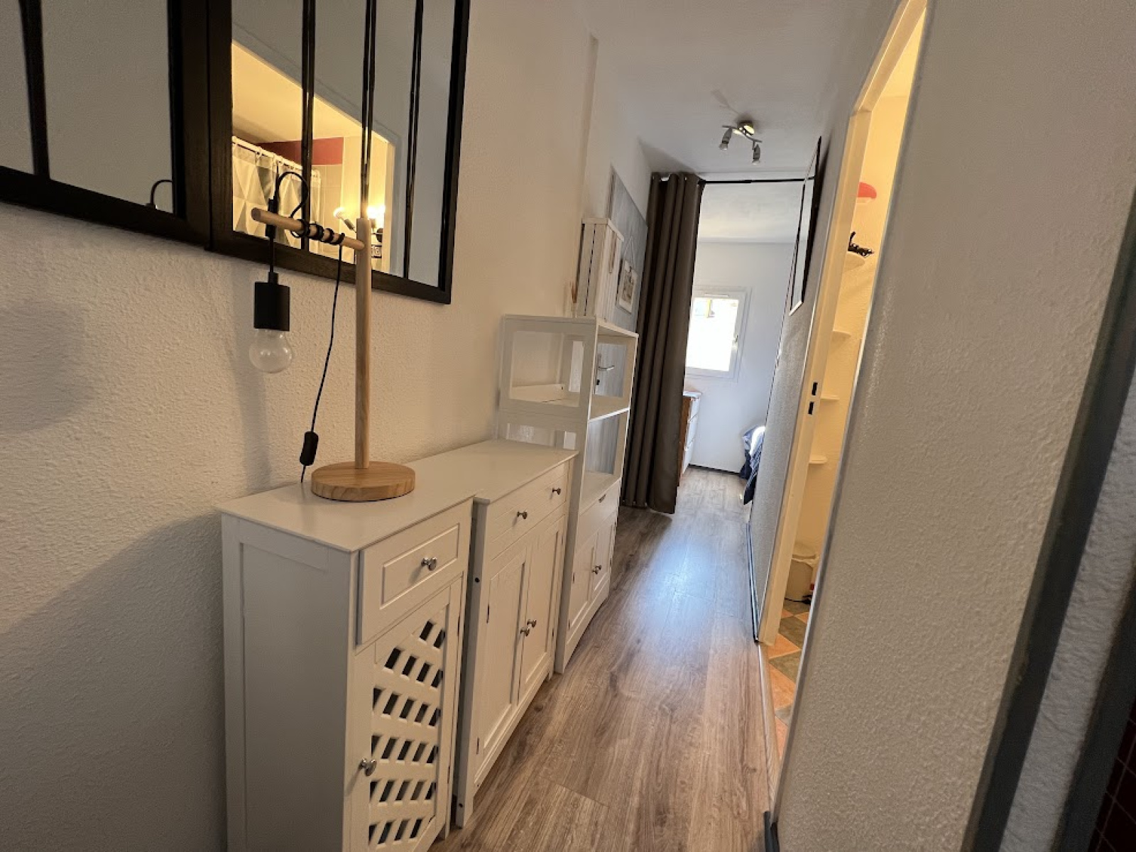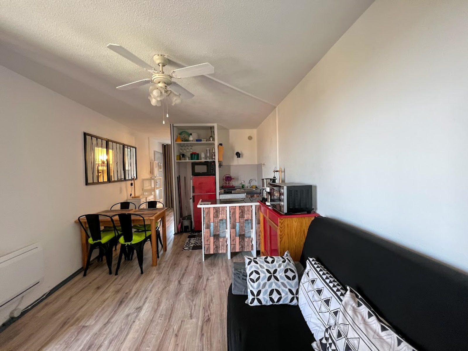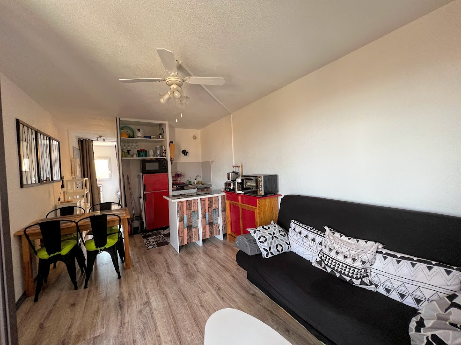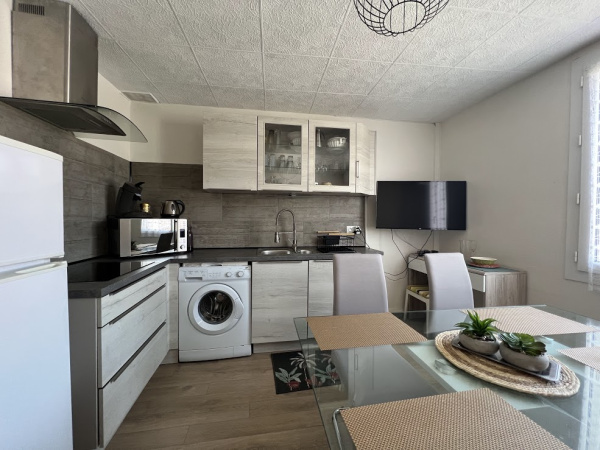 composé d'un séjour avec un canapé convertible pour 2 personnes, un coin cuisine équipé (lave linge) .une chambre avec un lit pour 2 personnes, salle d'eau et wc.