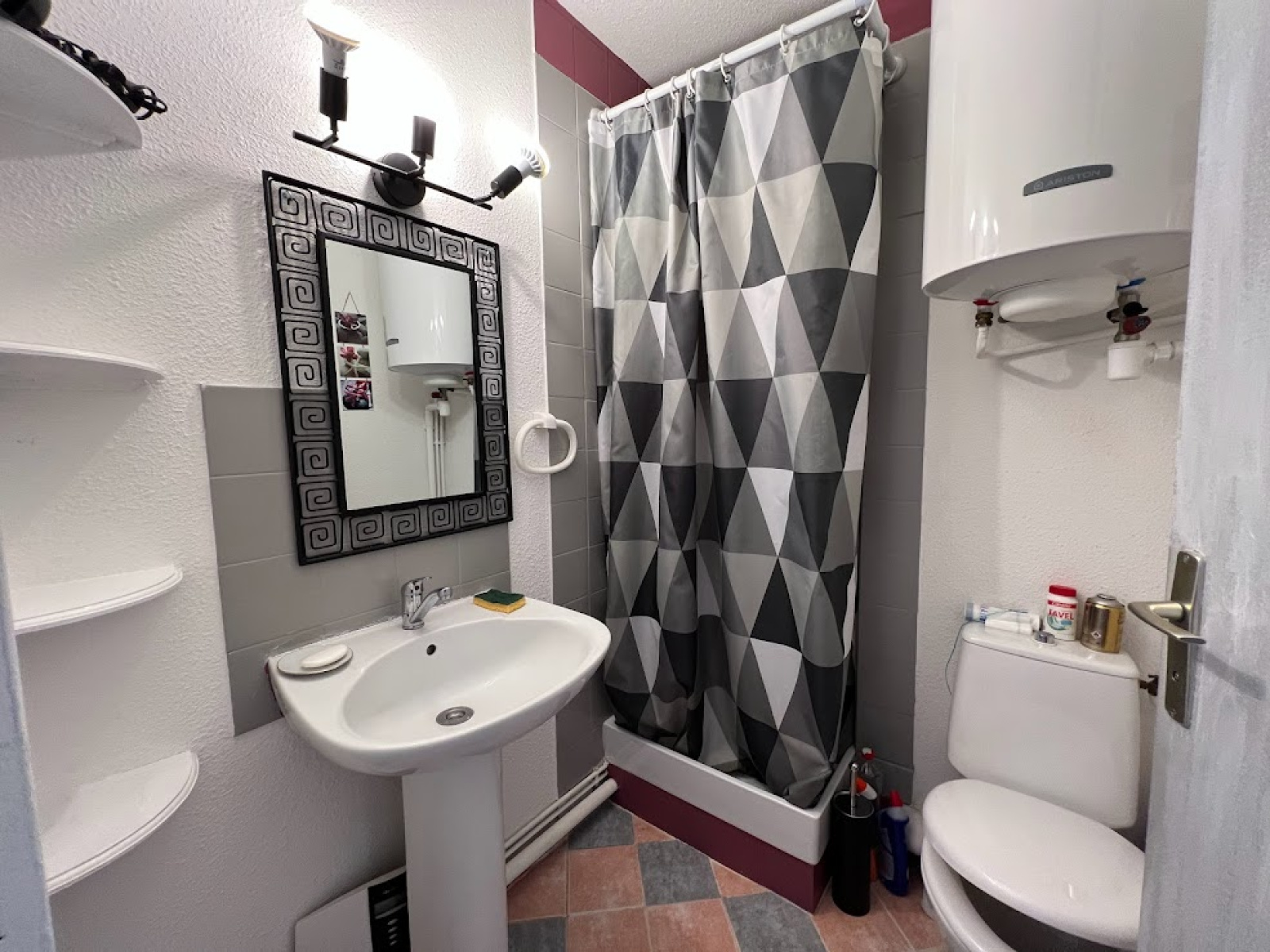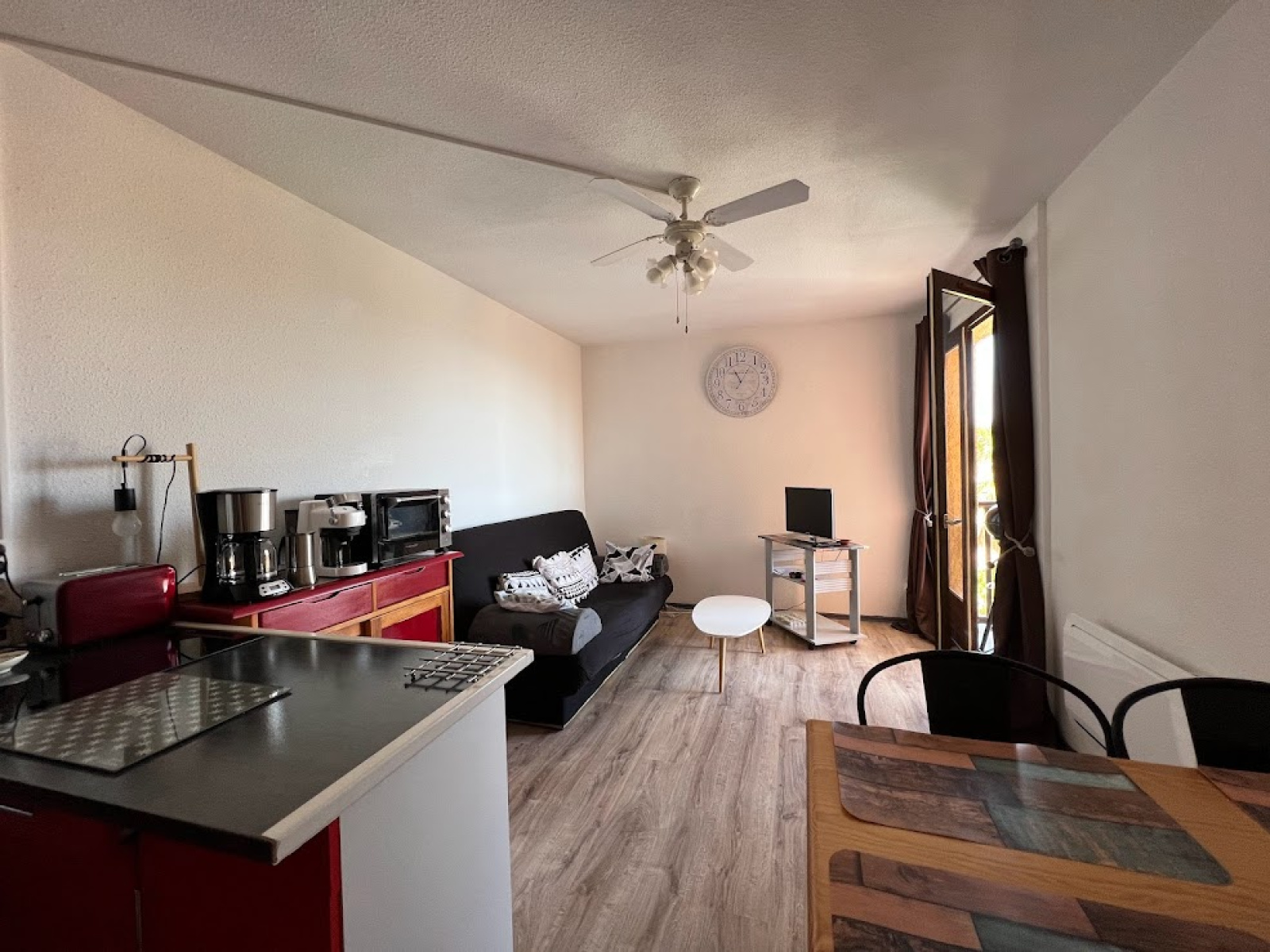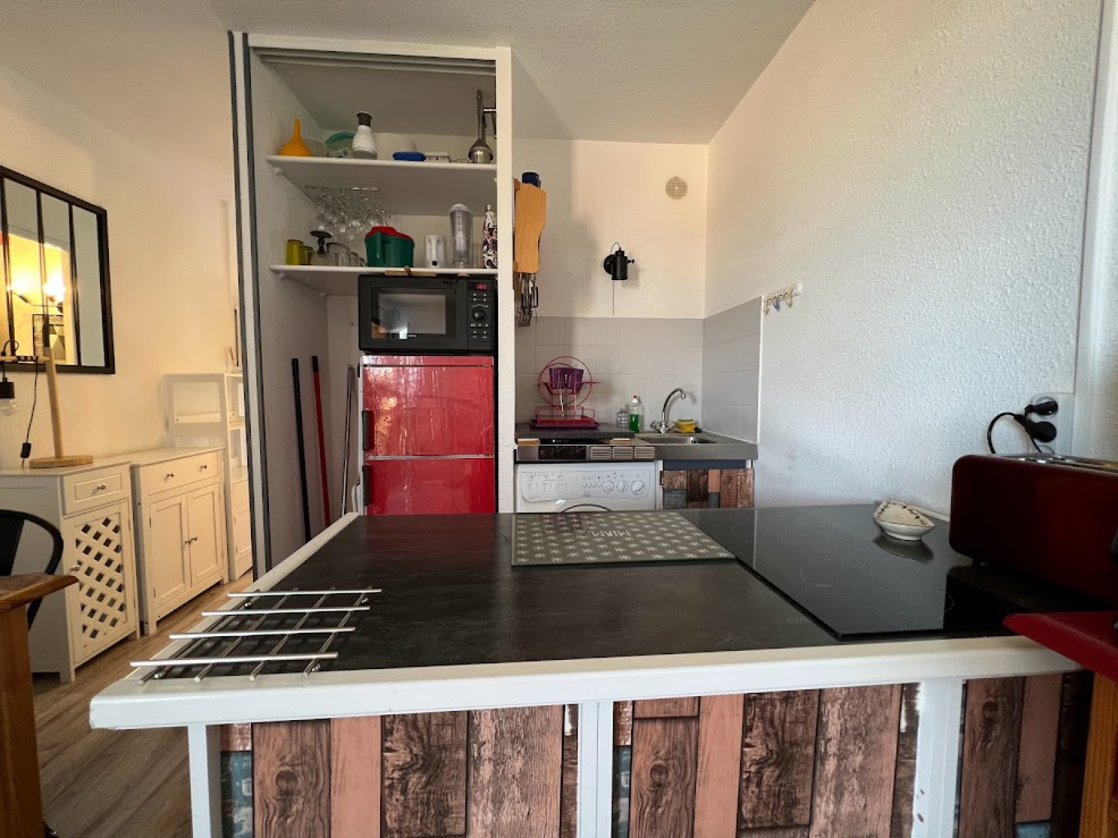 composé d'un séjour avec un canapé convertible pour 2 personnes, un coin cuisine équipé (lave linge) .une chambre avec un lit pour 2 personnes, salle d'eau et wc.