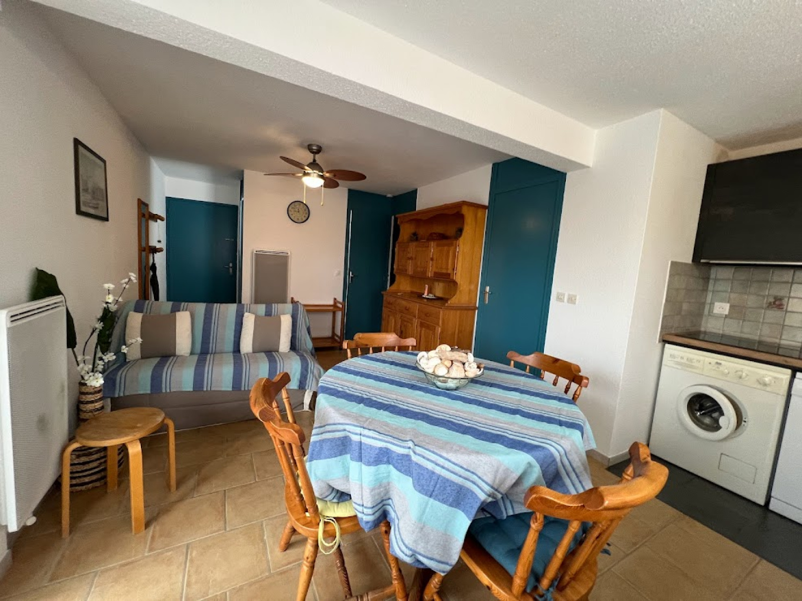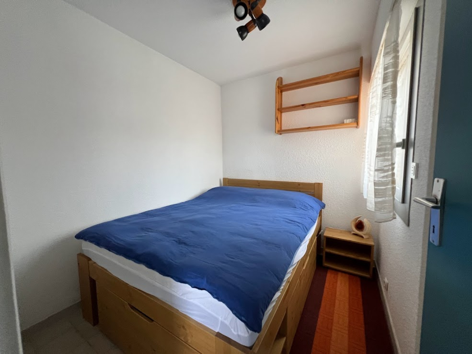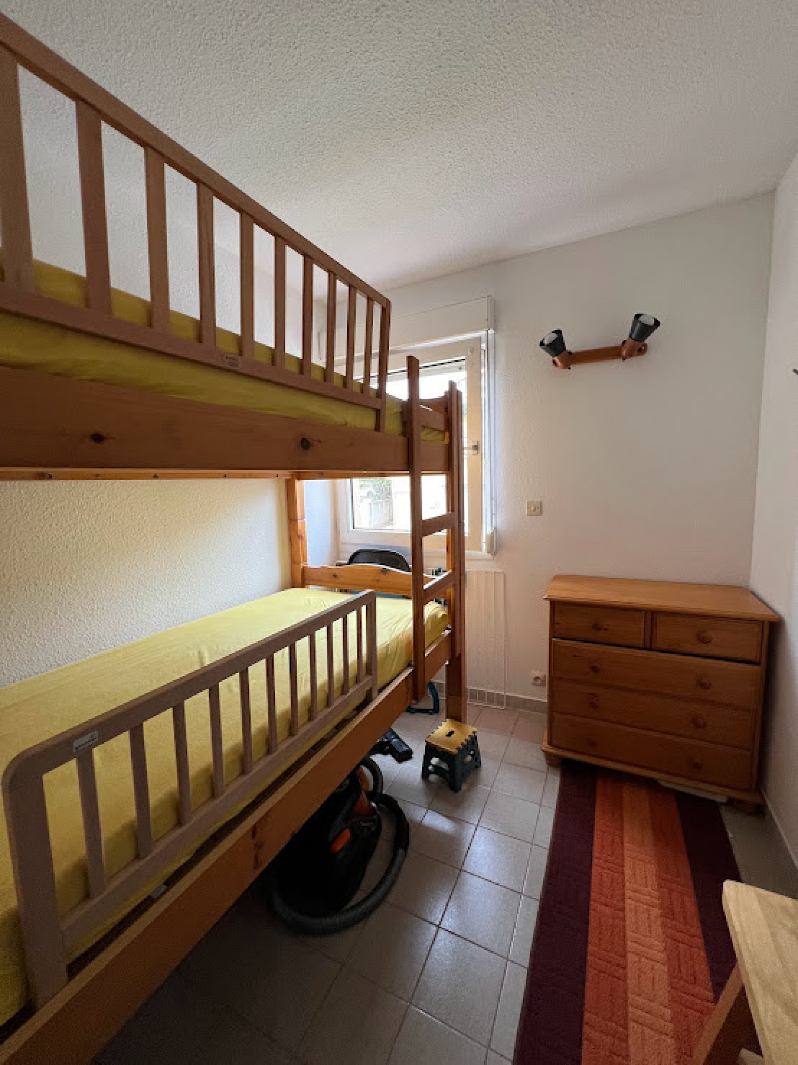 Dans une petite résidence située à 300 m de la plage env, appartement composé d'un séjour avec canapé, cuisine toute équipée (lave linge...) , une chambre avec un lit pour 2 personnes, et une chambre avec 2 lits superposés.