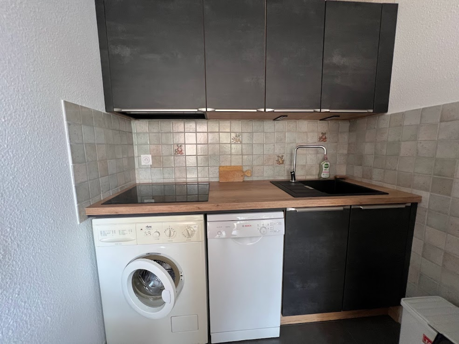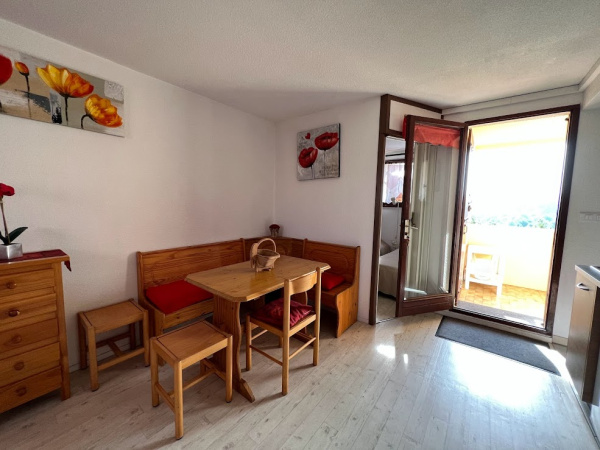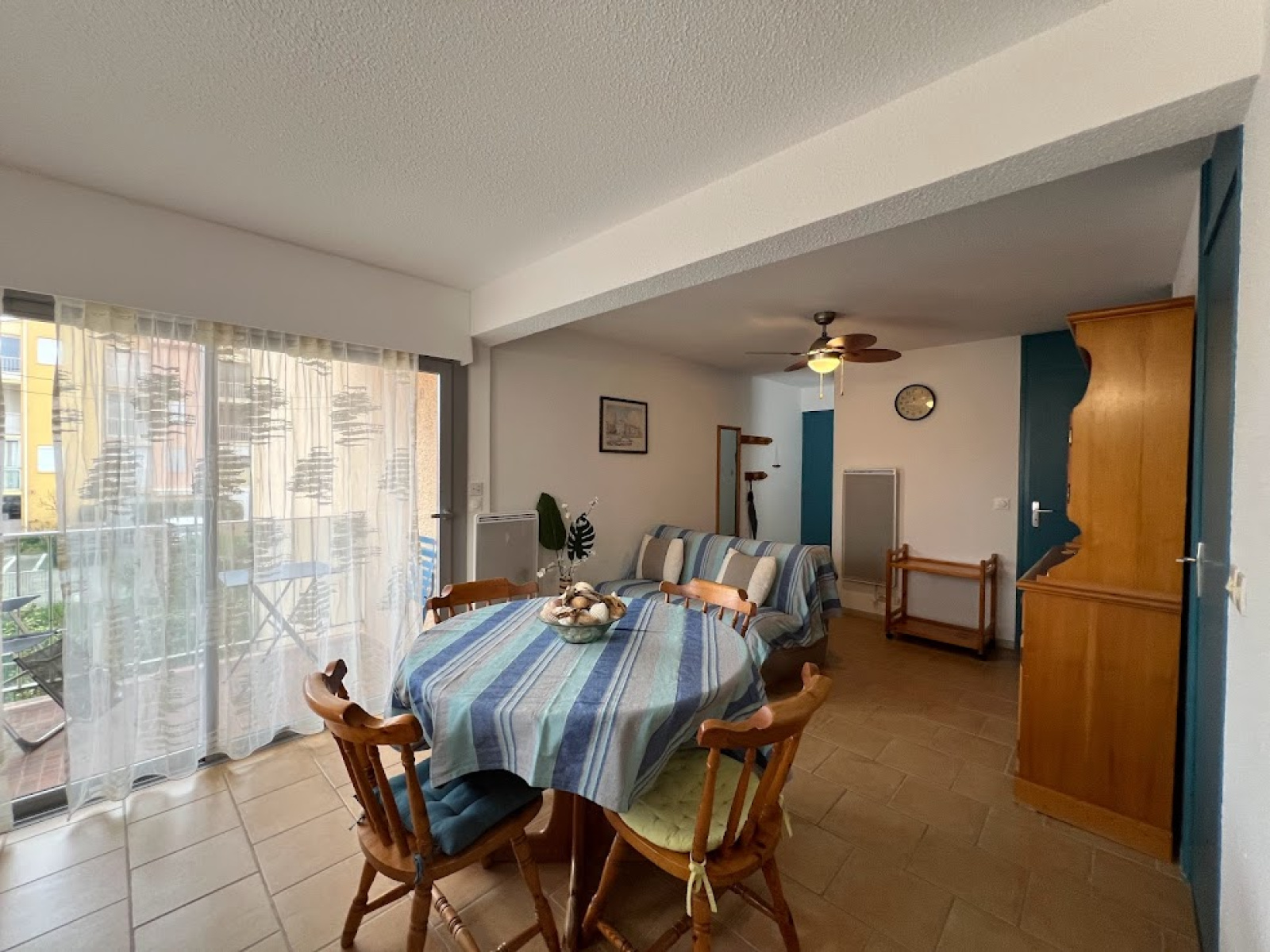 Dans une petite résidence située à 300 m de la plage env, appartement composé d'un séjour avec canapé, cuisine toute équipée (lave linge...) , une chambre avec un lit pour 2 personnes, et une chambre avec 2 lits superposés.