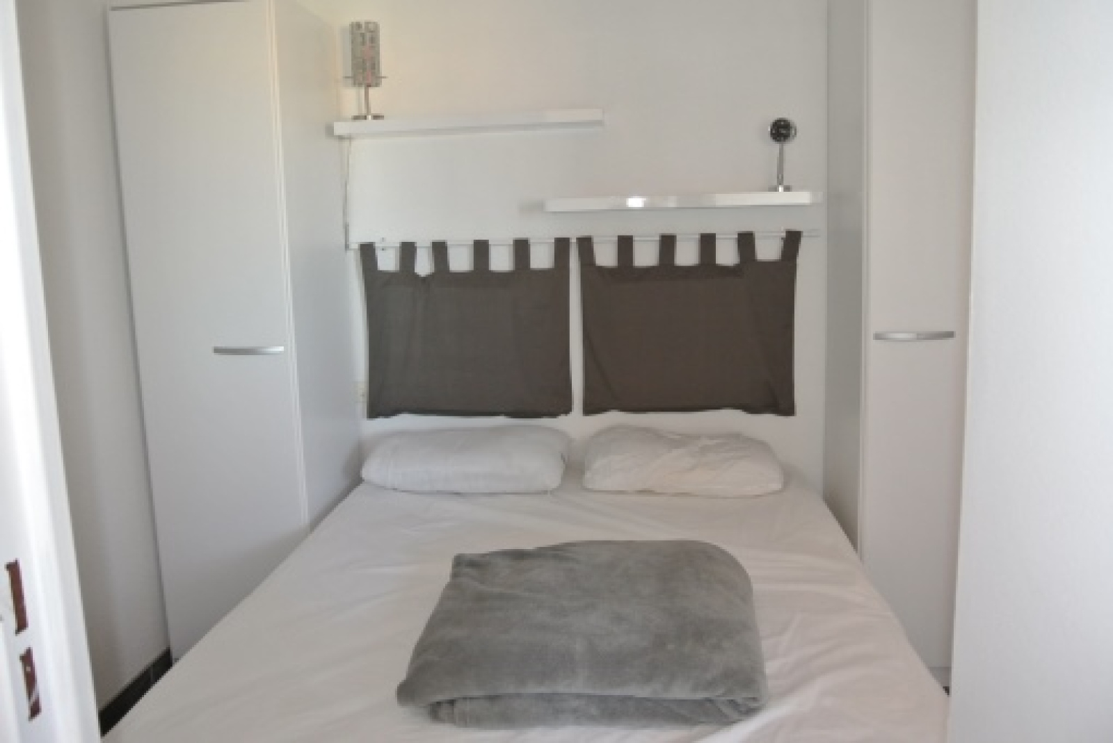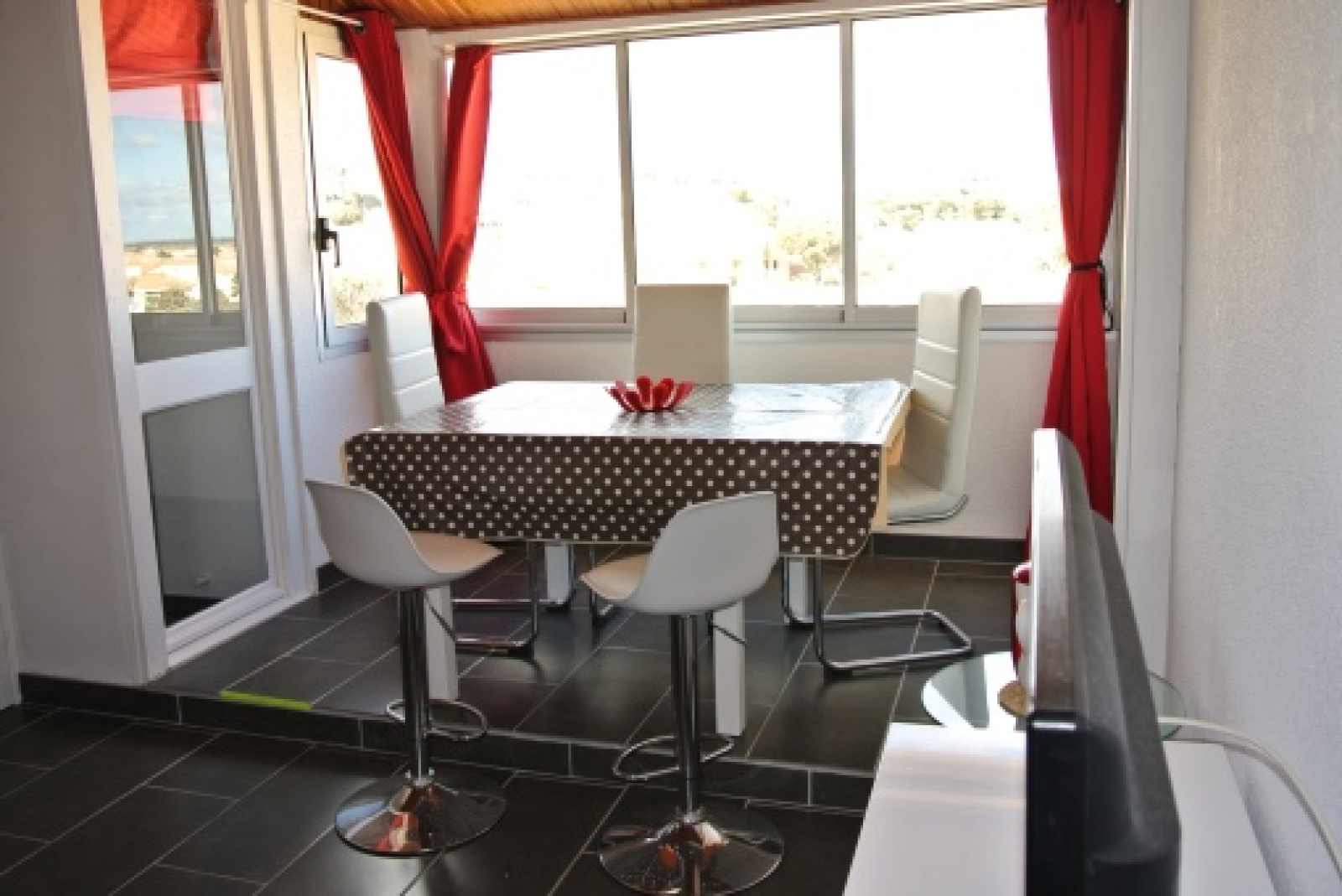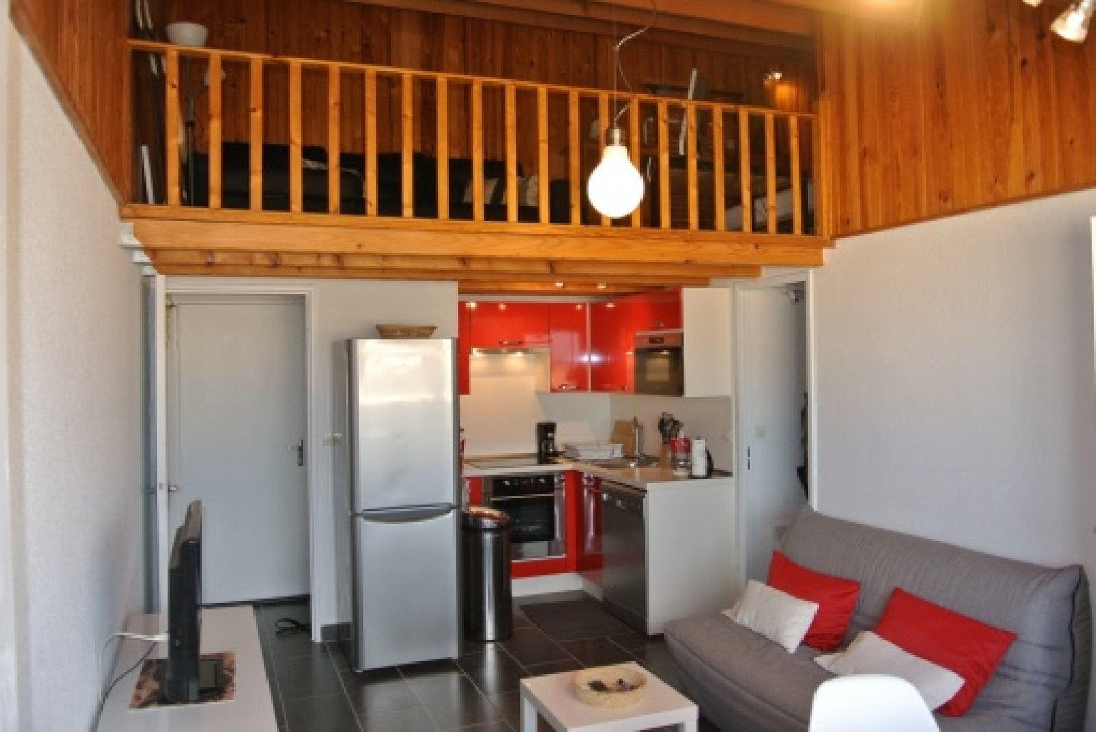Situé directement sur la plage, appartement 2pièces mezzanine avec loggia fermée avec véranda mer composé d'un coin cuisine équipé (lave linge, micro ondes, TV...), séjour avec un canapé convertible pour 2 personnes, une chambre avec un lit pour 2 personnes, une mezzanine avec un lit pour 2 personnes, et 2 lits pour une personne salle d'eau et wc séparés.