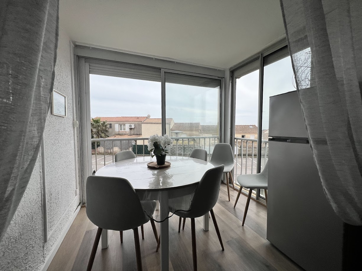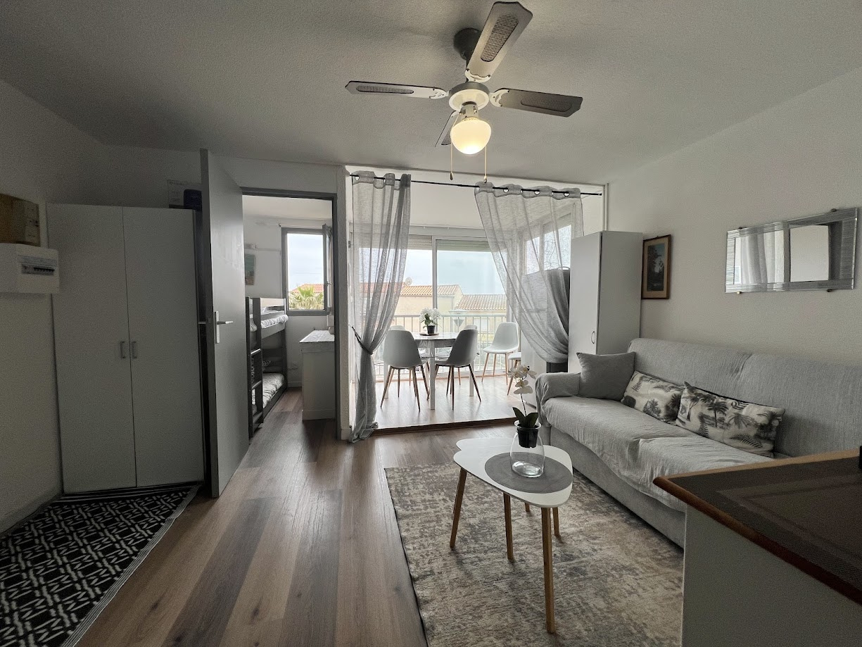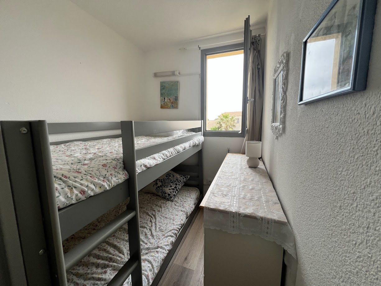 Situé au 1er étage , cet appartement lumineux, exposé plein sud, accueille jusqu’à 4 personnes. Idéal pour un séjour en bord de mer, il offre confort et praticité dans une résidence à proximité du massif de la Clape