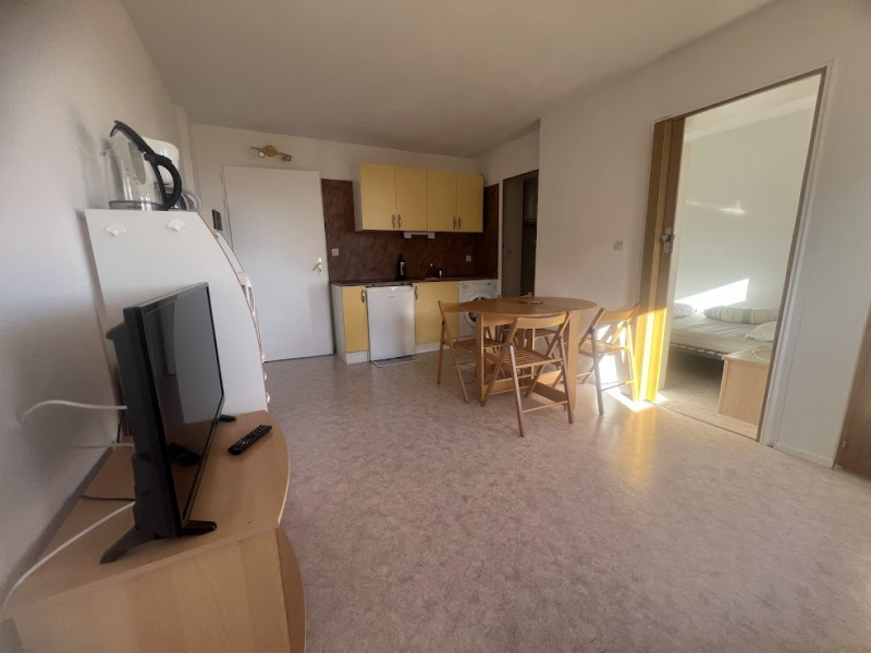 Appartement 2 pièces en rez de chaussée avec grande terrasse, il se compose d'un séjour avec coin cuisine tout équipé, salle d'eau et wc séparés, une chambre,loggia parking privé piscine dans la résidence env 800 m de la plage