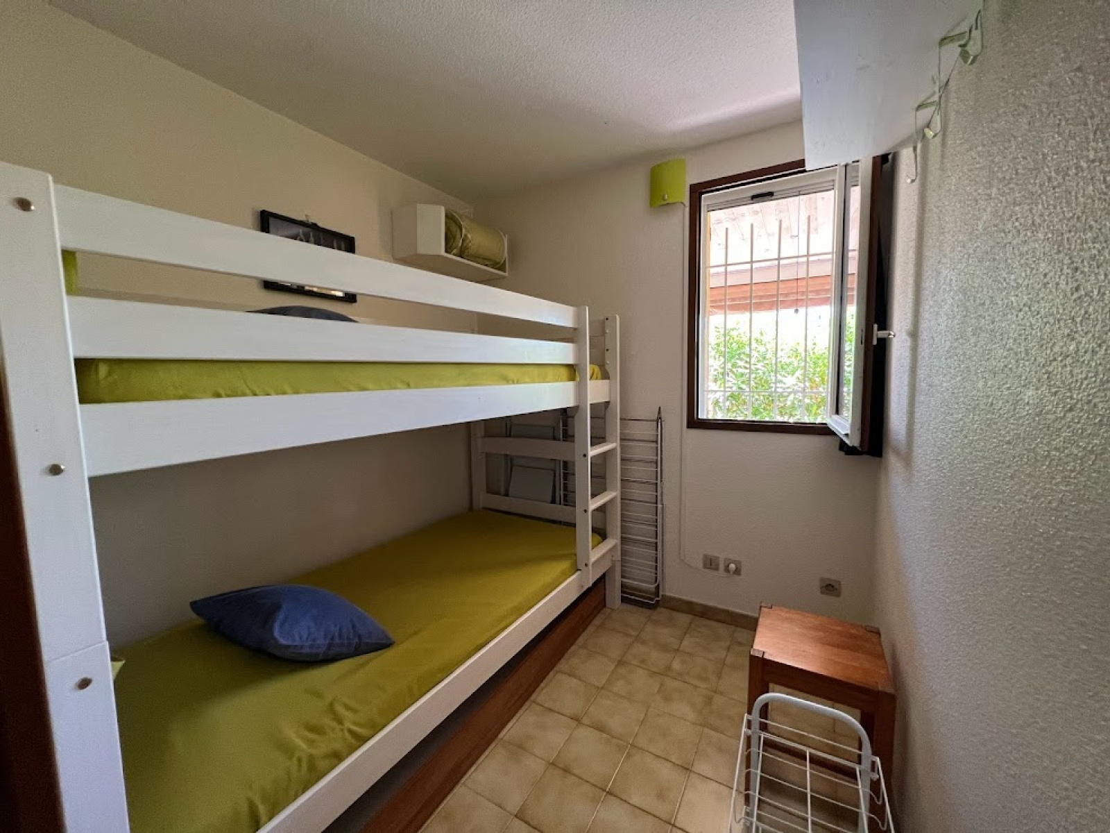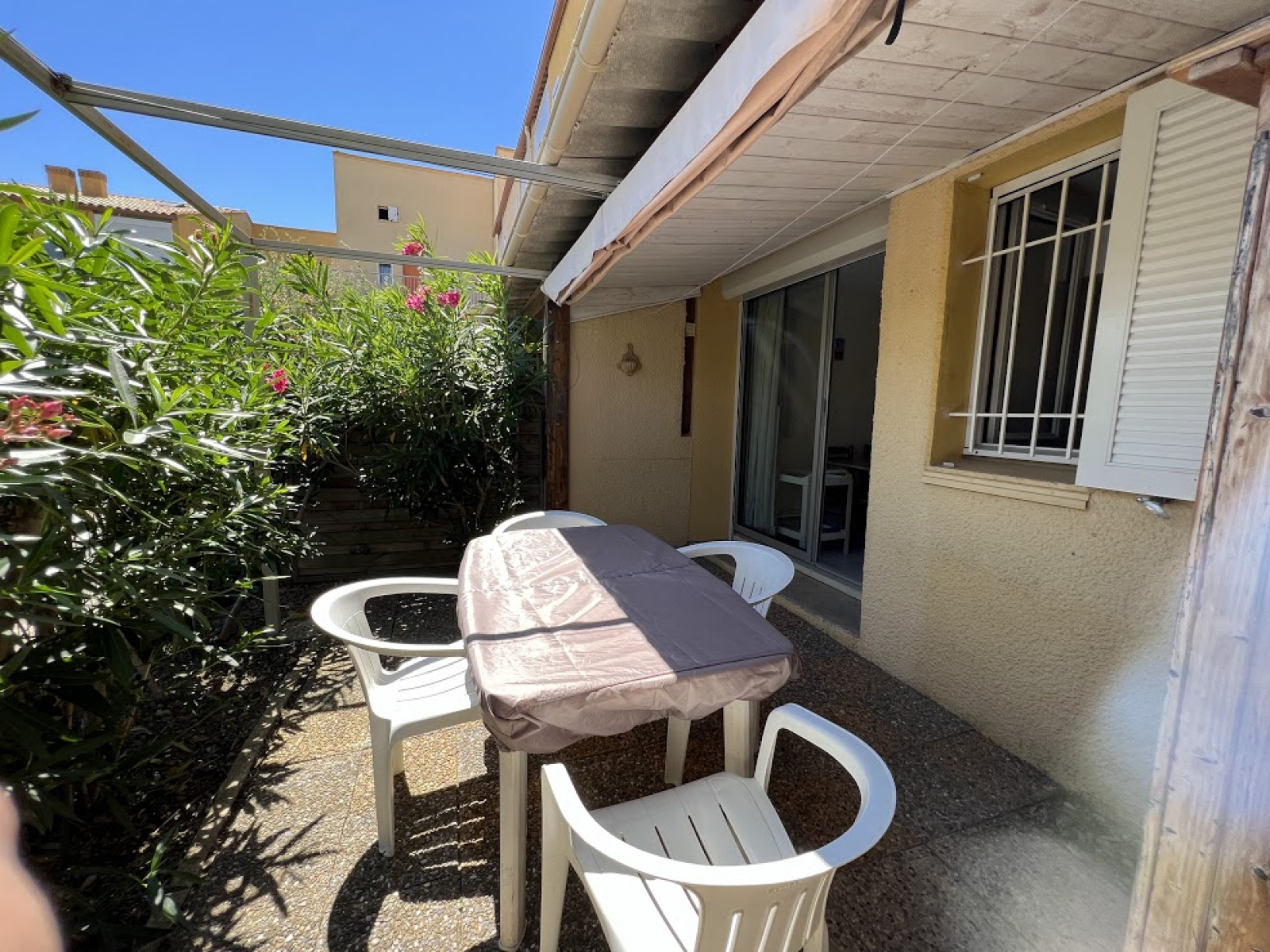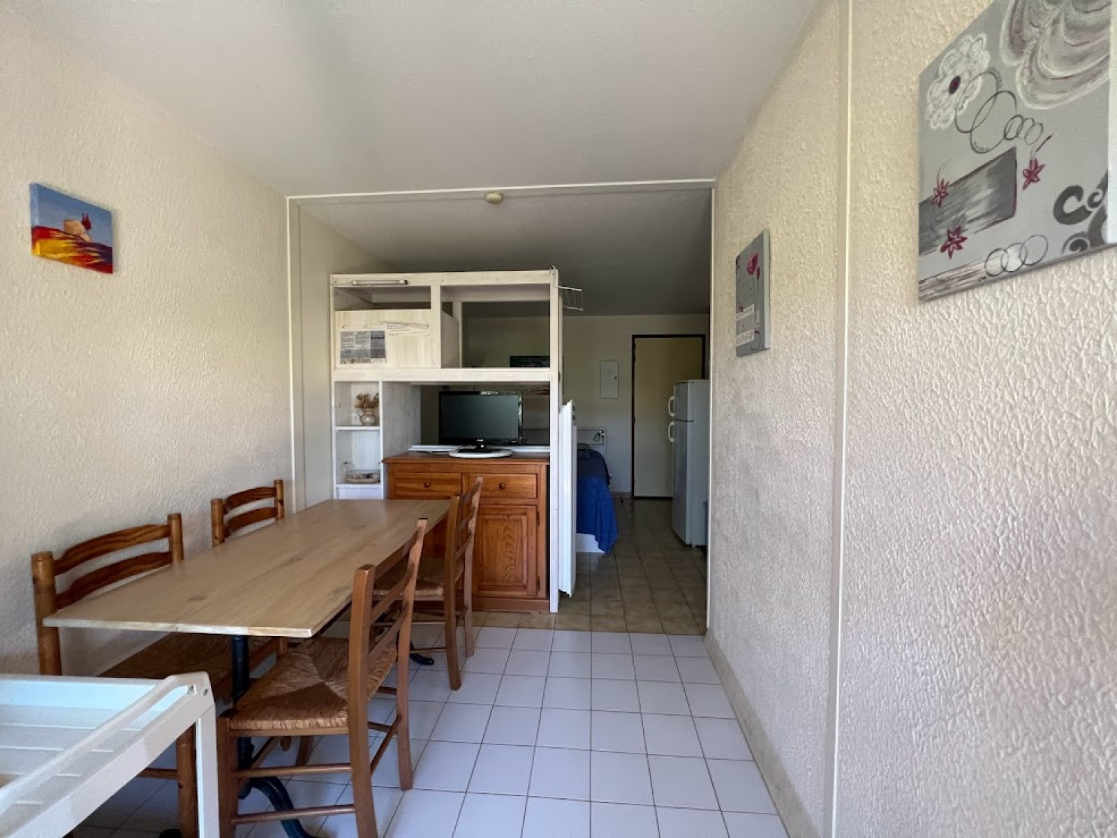 Dans une résidence avec piscine et tennis, situé à 600 m env de la plage et du marché, appartement en rez de jardin composé d'un séjour avec coin cuisine, salle d'eau avec douche et wc, une chambre.