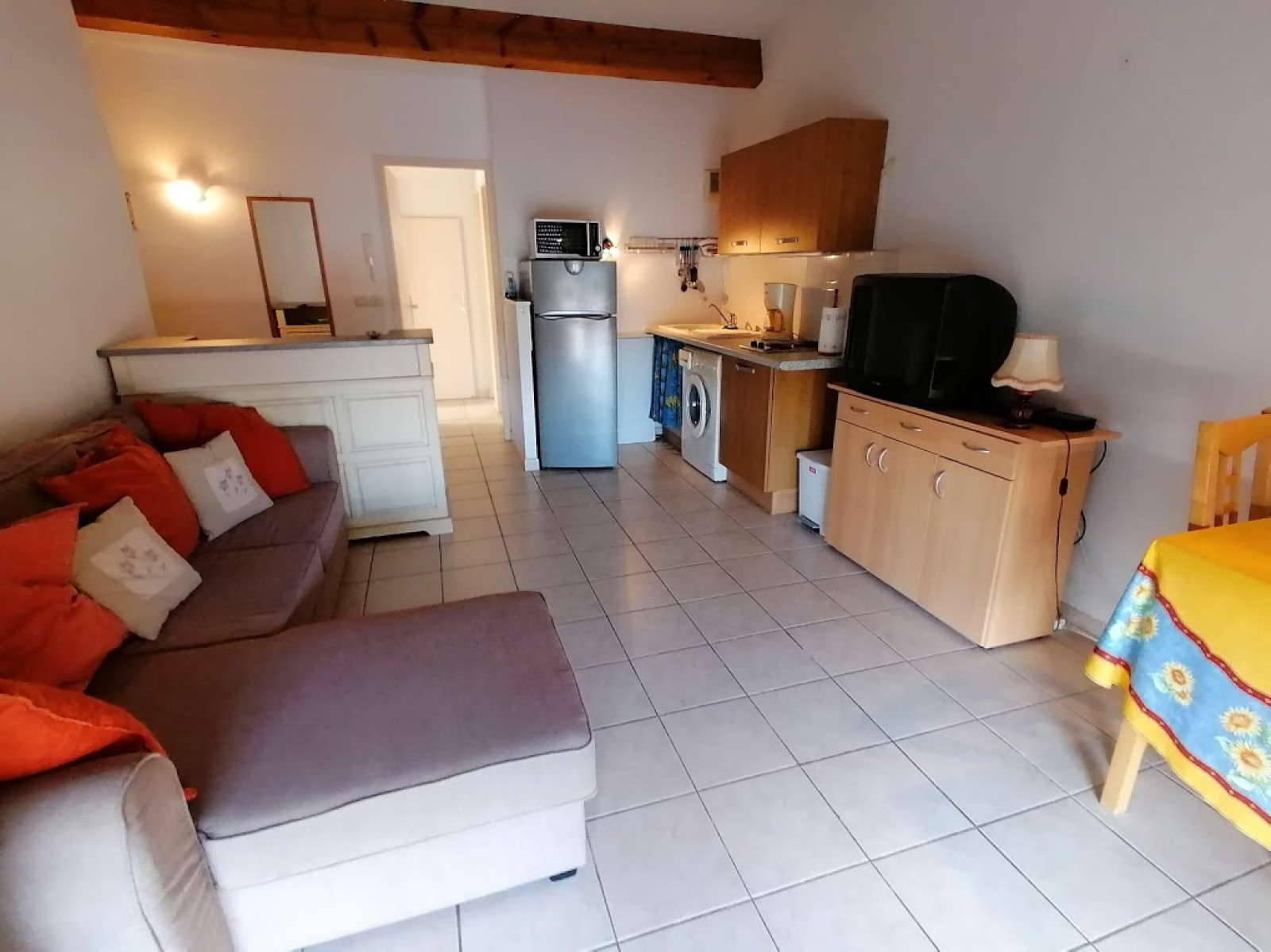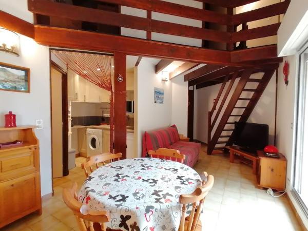 Proche du centre et de la plage, appt T2 CABINE, composé d'un séjour cuisine équipée, une chambre avec grand placard, une cabine fermée avec vélux, salle d'eau et wc séparés.