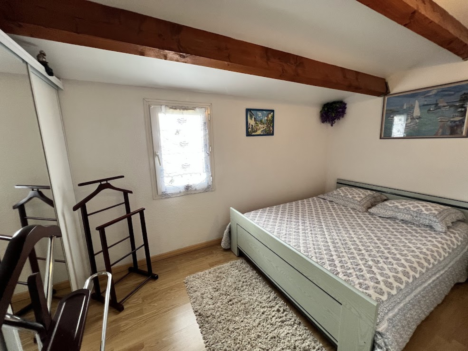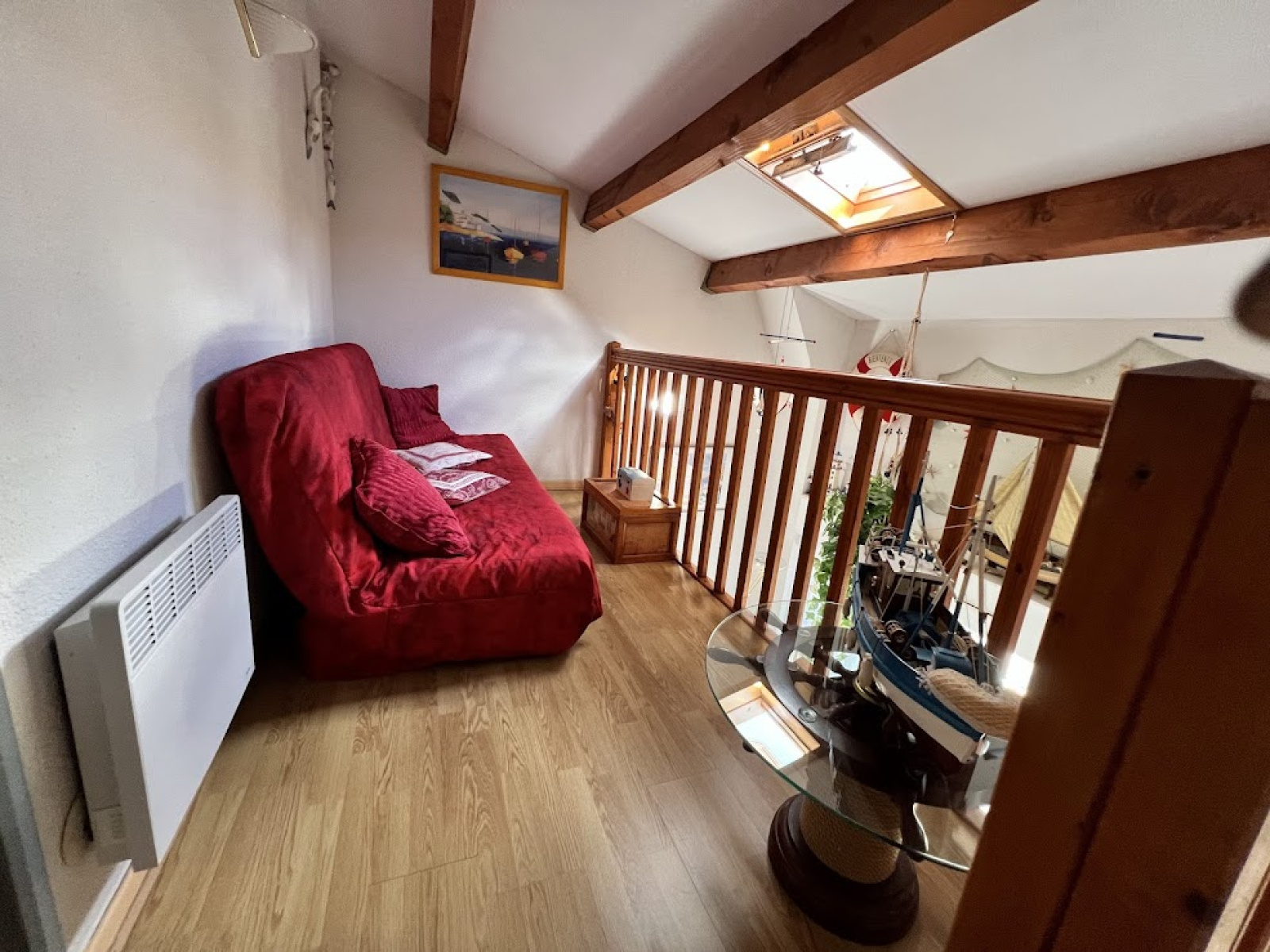 A l'étage, il y a 1 grande chambre avec placard, et une mezzanine avec fenêtre de toit parking privé vendu en partie meublé